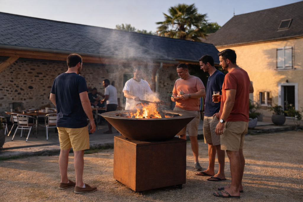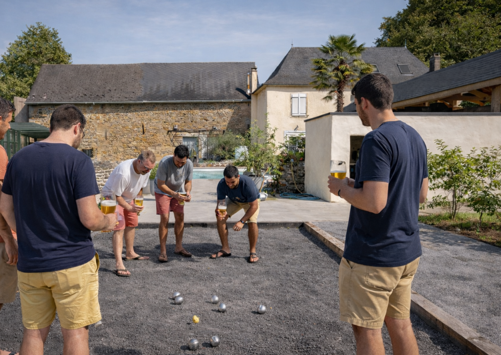 À la Ferme Sarthou, les soirées autour du braséro, à côté de la piscine couverte, sont des moments privilégiés qui font tout le charme du séjour. En fin de journée, place à l’apéritif convivial avec un tournoi de pétanque improvisé dans le jardin, pendant que le feu crépite et que la lumière décline sur la campagne béarnaise. Ces instants simples et authentiques, partagés en famille ou entre amis, incarnent parfaitement l’art de vivre en Béarn : prendre le temps, profiter de l’extérieur, se retrouver dans un cadre calme et préservé. Entre détente au bord de la piscine, rires autour du braséro et esprit de jeu à la pétanque, chaque soirée devient un souvenir marquant de votre séjour en maison de caractère au pied des Pyrénées.