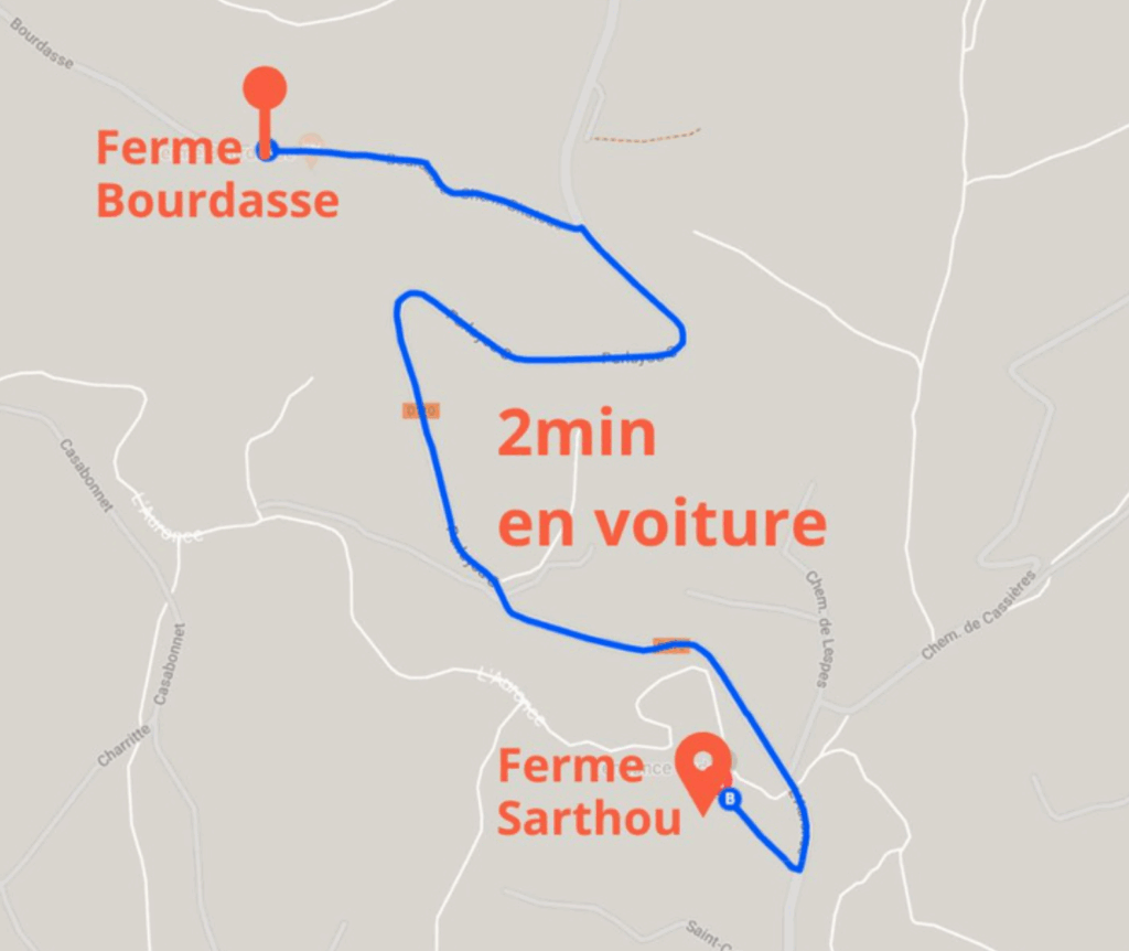 La Ferme Sarthou et la Ferme Bourdasse sont distantes de quelques centaines de mètres. En option, nous vous proposons des navettes et/ou vélos électriques pour naviguer facilement entre les deux sites.
